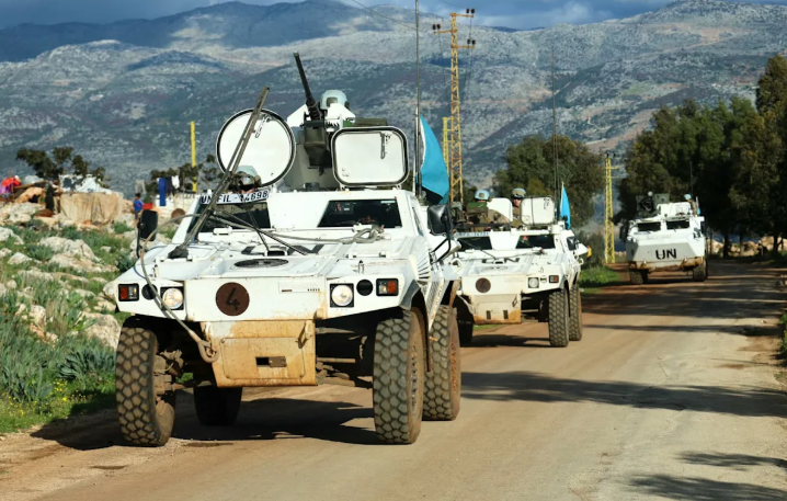 Liban Des Casques bleus français de la Force intérimaire des Nations unies au Liban (FINUL) patrouillent à l’entrée du village frontalier de Sarada, le 24 février 2026.